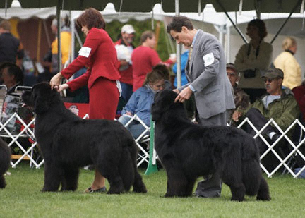 When bathing your Newfoundland, always use a good quality dog shampoo. These can be purchased at dog shows or in dog supply catalogs. I like to use a concentrated shampoo that I dilute appropriately. After you have your dog all lathered up, take a little extra time to give a good body massage. This makes for a good experience for the dog in getting a bath. Be sure to rinse the coat thoroughly, as any shampoo left in the coat can cause flaking and other problems. Following the bath, dry your potential show dog with a blow dryer. The more powerful ones shorten the time required! It is best to comb the dog in the direction the coat lays the entire time the drying process is occurring. This can help train the coat to lie flatter and eliminates dryer mats.